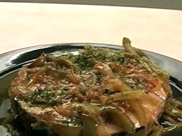 Рецепт приготовления тунца с овощами.Состав:тунец — 1 кусок;белое вино — 200 гр;перец — 1 штука;лук — 1 штука;петрушка — 1 пучок;чеснок — 2 зубчика;соль, масло.